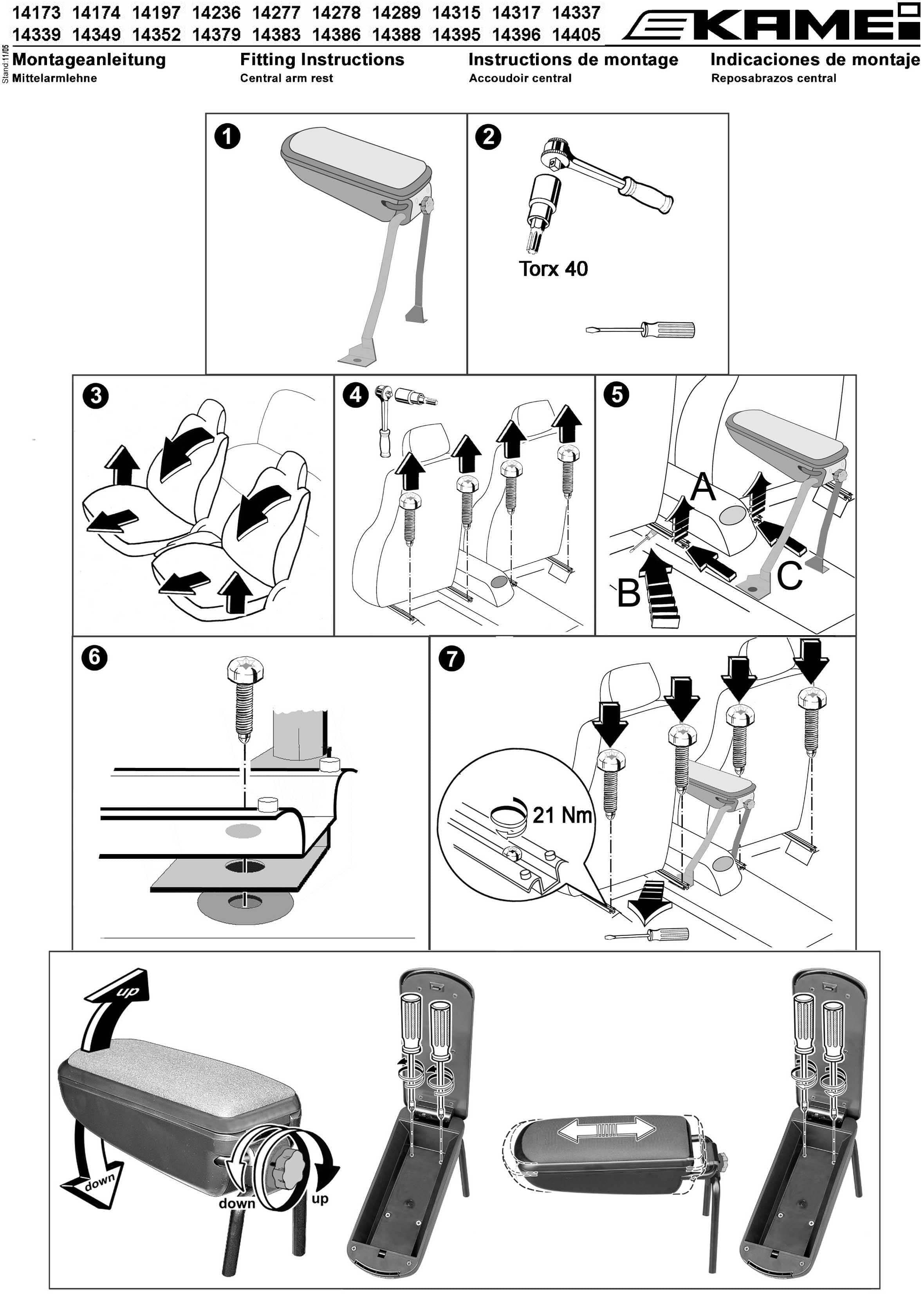 KAMEI Art.-Nr. 0 14388 21 Stoff schwarz. Premium Mittelarmlehne. Montage ohne Bohren. In Längsrichtung verstellbar. Senkrecht hochklappbar. Im Neigungswinkel stufenlos einstellbar. Erstausrüsterqualität. Fahrzeugliste beachten!